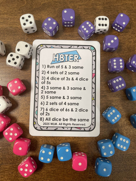 Setup: Each player receives a level card and 8 matching dice (4 different colors are included in the Base Game). Select one player who will be the first to announce the beginning of round 1.